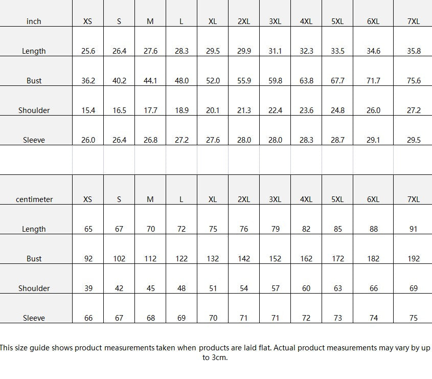 | centimeter | XS | S | M | L | XL | 2XL | 3XL | 4XL | 5XL | 6XL | 7XL |